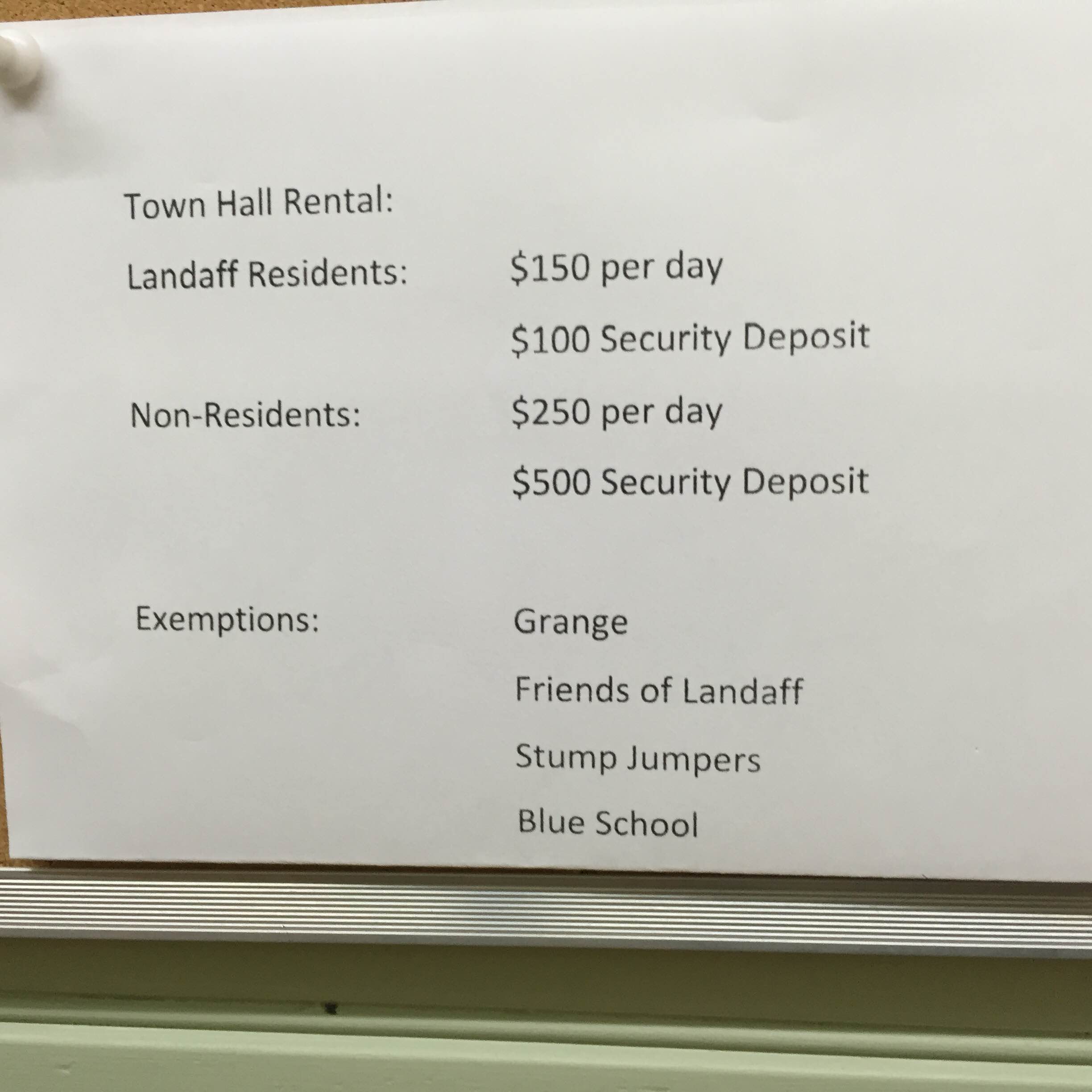 Use of Town Hall FRW-Landaff / June 14, 2016 Some of you have asked what the Select Board decided about rentals of Town Hall for family parties and activities. This sign is posted near the Town Clerk’s office. Share this: Click to share on X (Opens in new window) X Click to share on Facebook (Opens in new window) Facebook Like Loading...