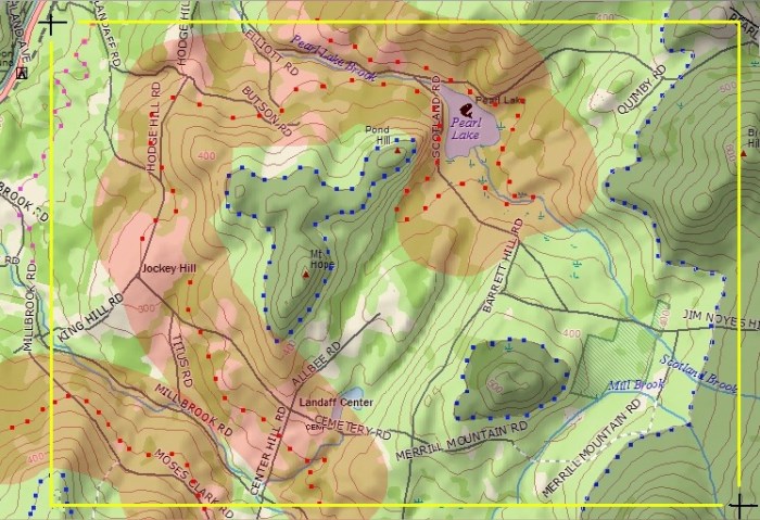 The balloon hasn’t been located. It’s outfitted with a tiny solar panel that emits a signal when the sun is out. Mike has spent a couple of days driving around the area looking for it (he calls it fox hunting), but with no luck. The two 36″ diameter silver (mylar) taped-together balloons are likely hanging from a tree on a western slope at an elevation of about 1100+ feet. The pinkish areas on the map below shows where Mike thinks it could have landed: