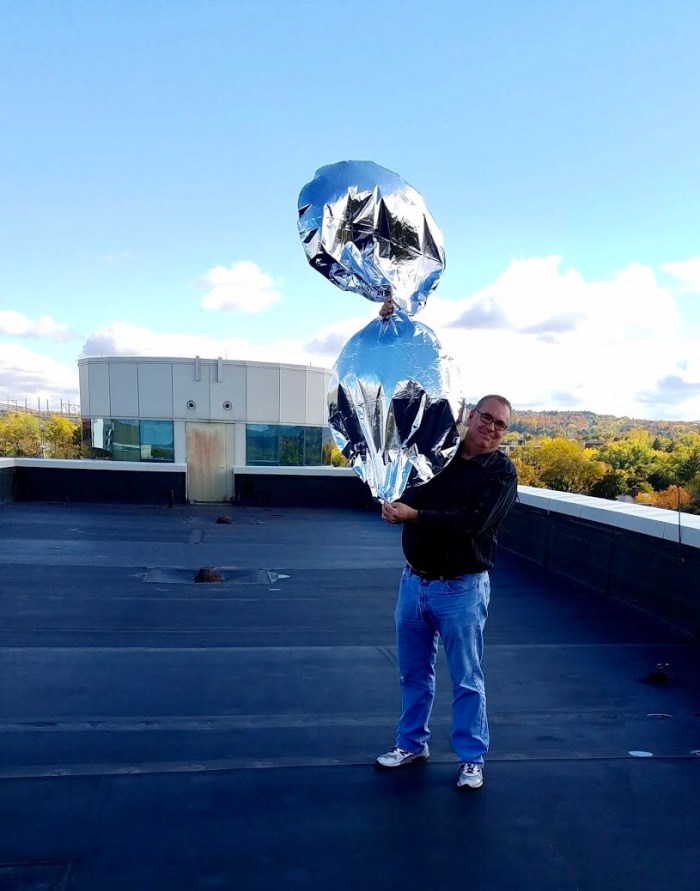 A Mylar balloon rig with a solar powered tracker flew completely around the globe in ten days last month, only to crash-land somewhere in Landaff. Mike Hojnowski, a Cornell IT guy, launched a high altitude balloon from the Cornell campus on Ithaca, NY on October 19th. It was tracked by ham operators traveling completely around the world in the upper atmosphere. The two balloons tied together with solar-powered tracking equipment took only ten days to cross the Atlantic Ocean, Europe, Iran, China, the Pacific, traverse the northern USA and cruise right past its Ithaca launch site. After all that it kept on flying until it plopped down in Landaff on October 29th. Here’s the launch: