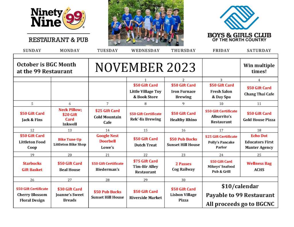Only twelve days left to purchase your CALENDARS for a chance to win great local gifts MULTIPLE TIMES throughout November and support your local Boys & Girls Club in Lisbon! All proceeds from the Littleton 99 Restaurant fundraisers in October, help us to continue to provide quality, affordable childcare for working families, especially those who need us most. THANK YOU for your support.