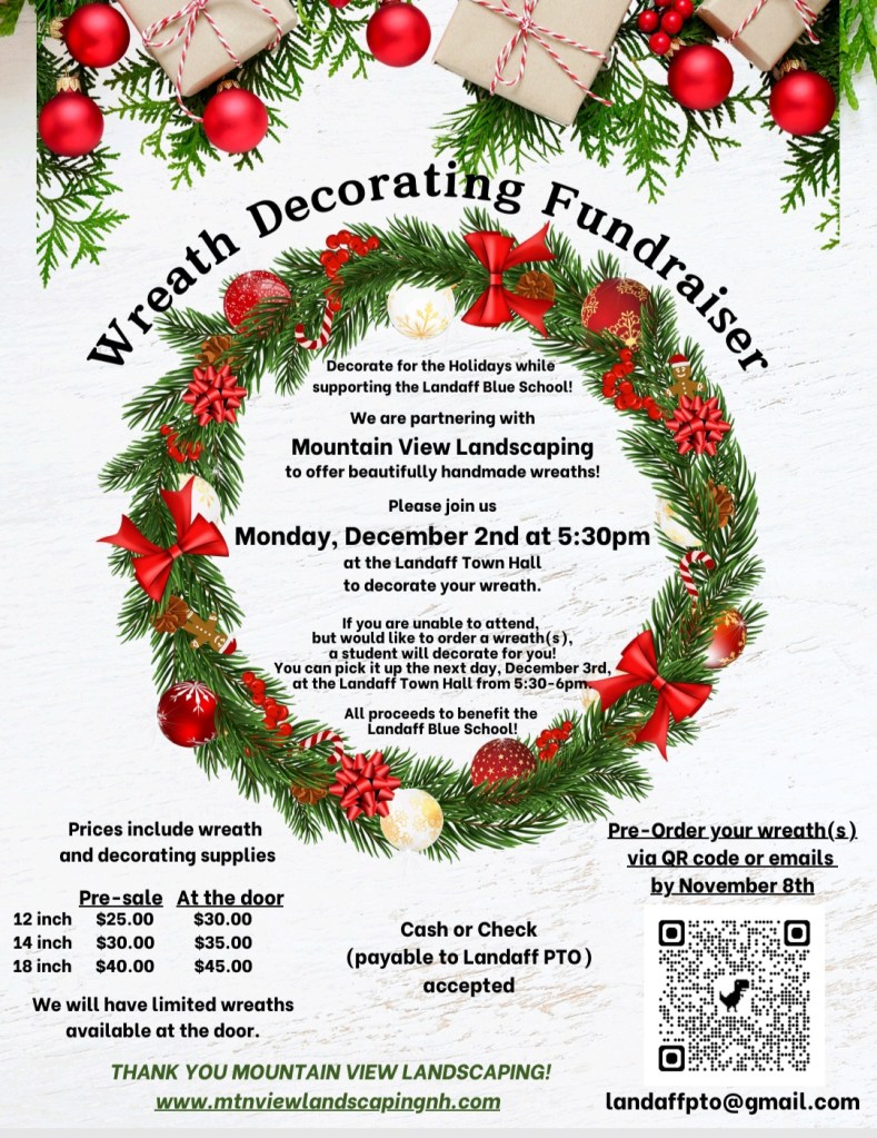 Wreath Making sandybrackett / October 12, 2024 Requested by Rhiannon Copithorne on behalf of the Landaff Blue School PTO: Wreath Decorating FundraiserDownload Share this: Click to share on X (Opens in new window) X Click to share on Facebook (Opens in new window) Facebook Like Loading...