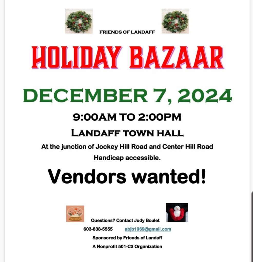 Holiday Bazaar sandybrackett / October 24, 2024 Requested by Judy Boulet, Friend of Landaff; Share this: Click to share on X (Opens in new window) X Click to share on Facebook (Opens in new window) Facebook Like Loading...