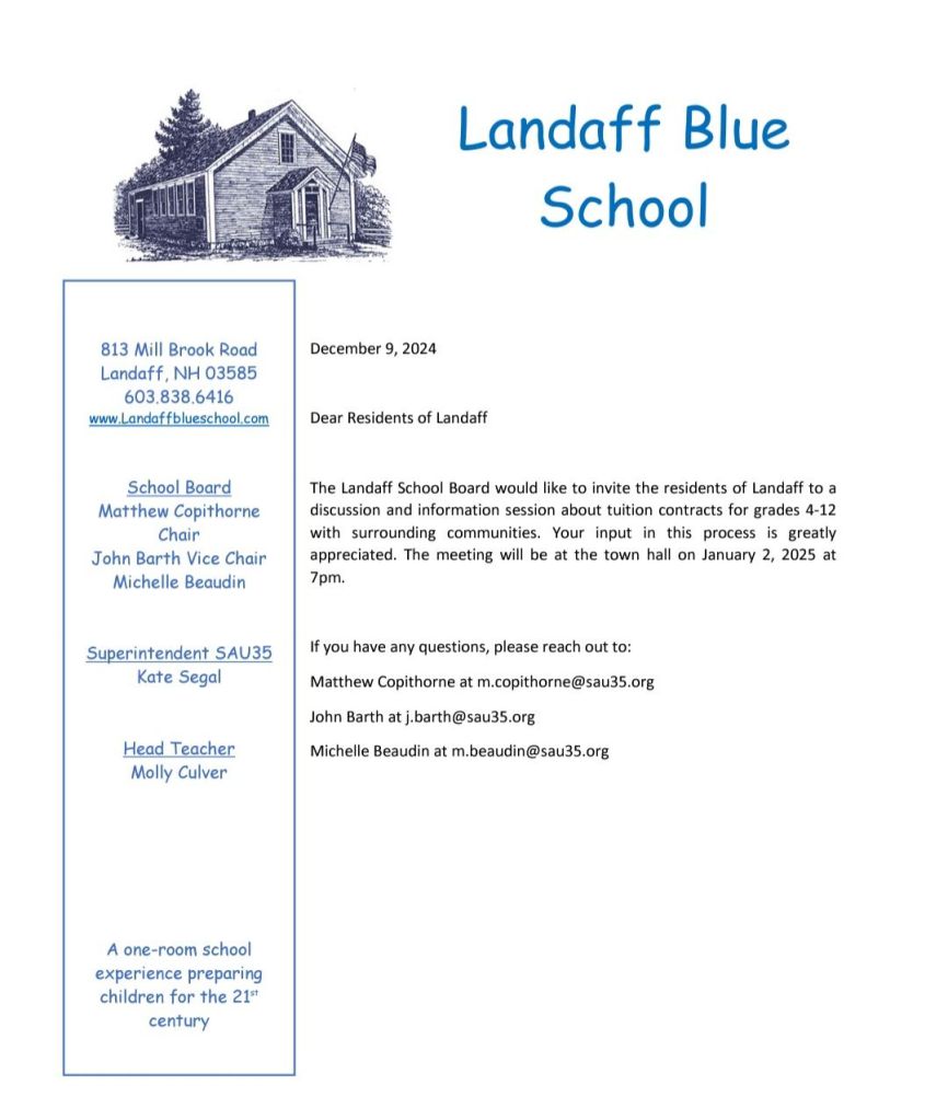 Blue School Tuition Meeting sandybrackett / December 31, 2024 Share this: Click to share on X (Opens in new window) X Click to share on Facebook (Opens in new window) Facebook Like Loading...