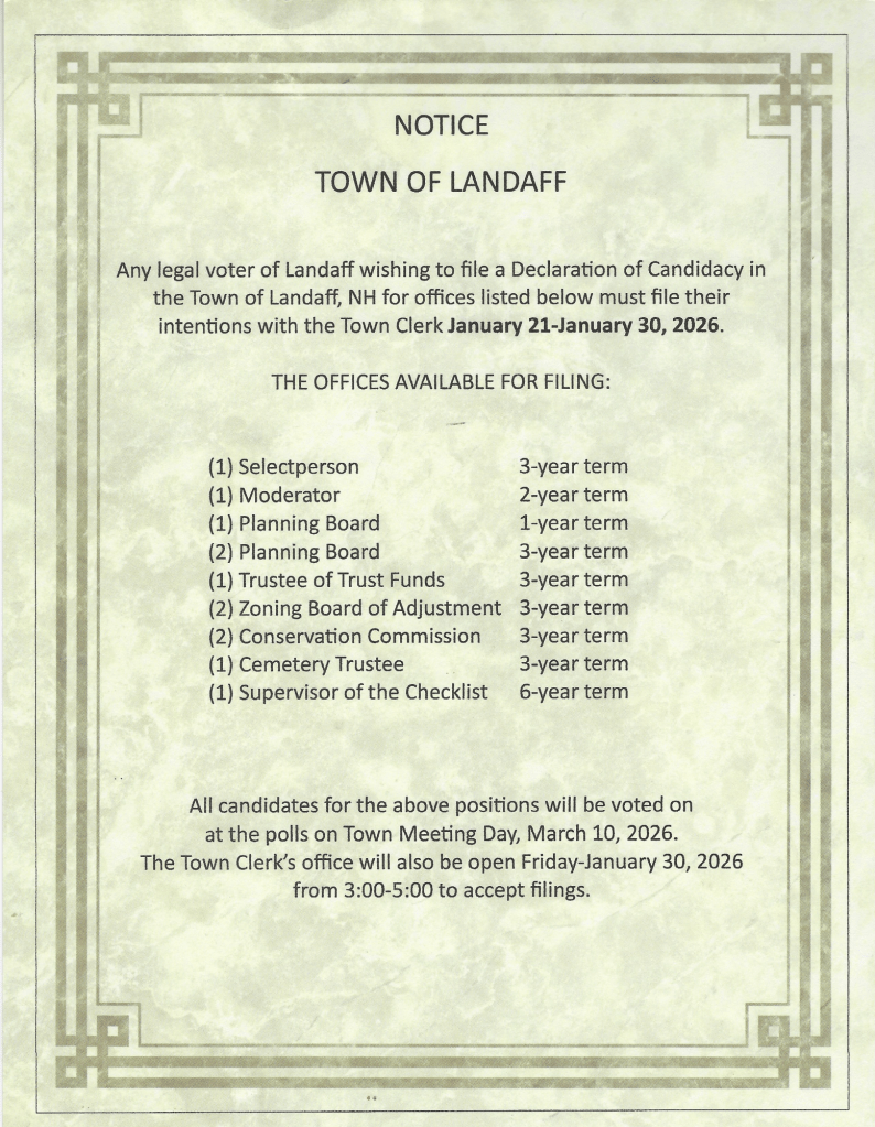 Landaff Open Offices sandybrackett / 2 hours ago January 16, 2026 From the desk of Cathy Ferony, Landaff Town Clerk: Share this: Share on X (Opens in new window) X Share on Facebook (Opens in new window) Facebook Like Loading...