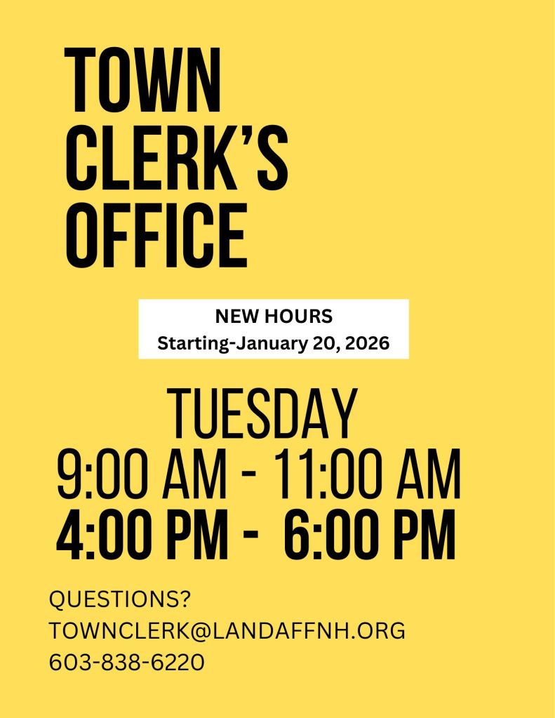 Landaff Town Clerk’s Office Hours sandybrackett / 2 hours ago January 16, 2026 From the desk of Cathy Ferony, Landaff Town Clerk: Share this: Share on X (Opens in new window) X Share on Facebook (Opens in new window) Facebook Like Loading...