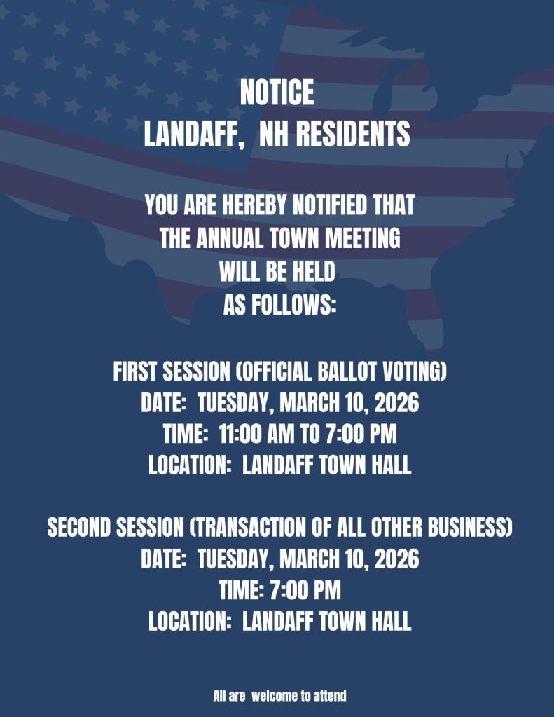 Landaff Town Meeting sandybrackett / 23 hours ago February 10, 2026 From the desk of Cathy Ferony, Landaff Town Clerk: Share this: Share on X (Opens in new window) X Share on Facebook (Opens in new window) Facebook Like Loading...
